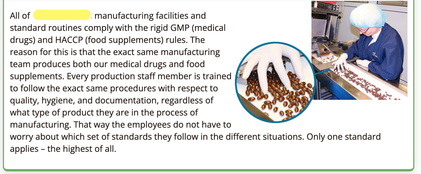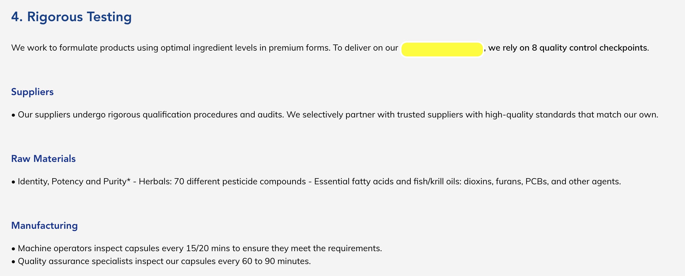 Companies that describe their manufacturing process in detail give me confidence that they did the homework. Websites that mention nothing on their website are a bit questionable. This means they are white labelling. White labelling happens when companies contract manufacturing to a company that manufactures for hundreds of other companies. You just put the brand label on.