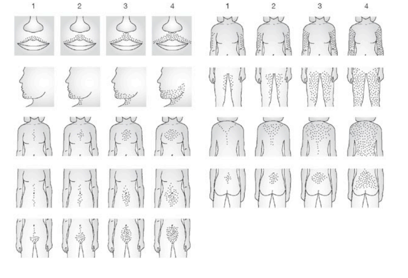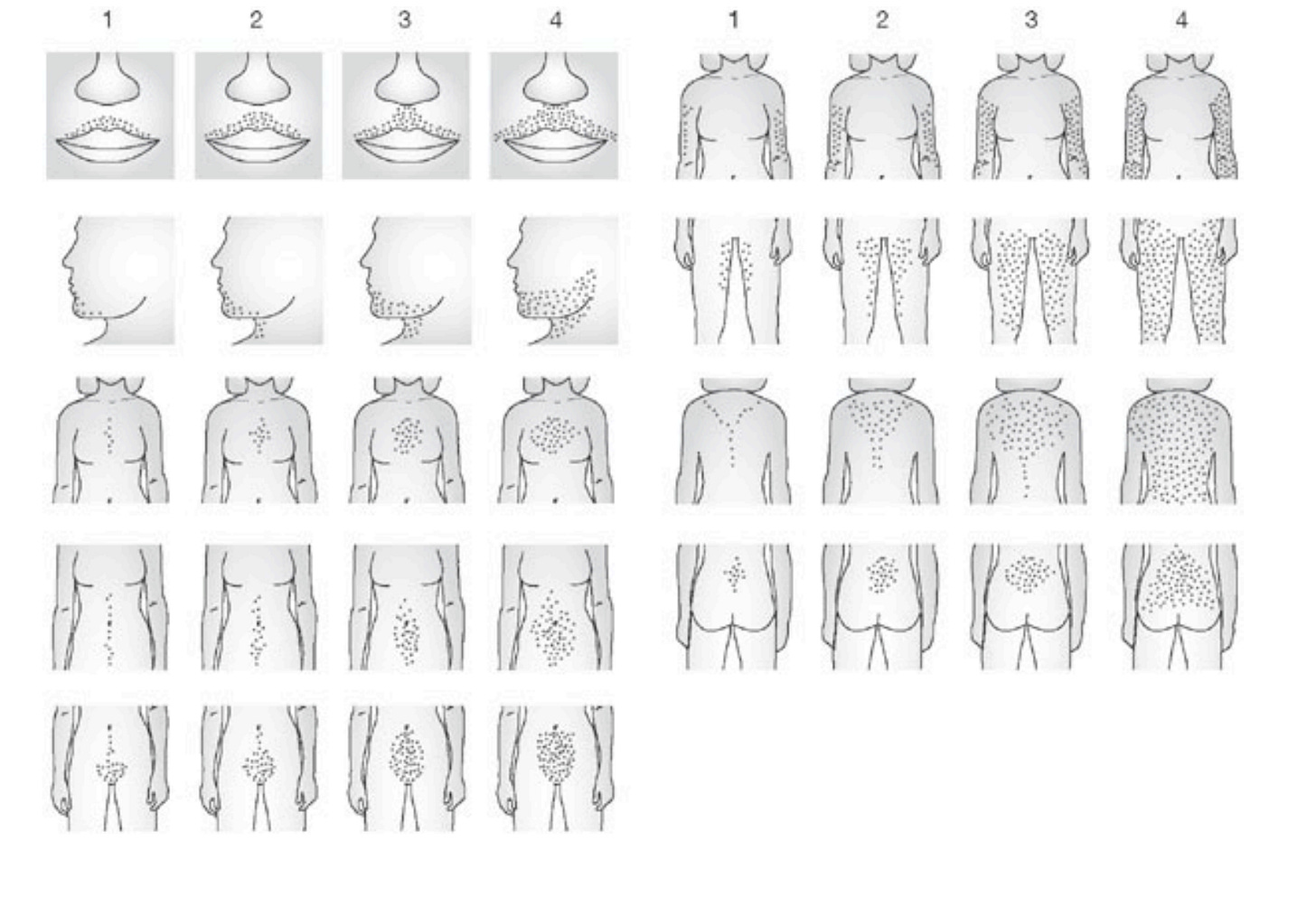The level of hirsutism can be measured using a scoring system called the modified Ferriman-Gallwey (mFG) system, which measures the severity of hair growth across nine different areas of the body, chest being one of them. Not specifically nipples, but chest. These are the areas: