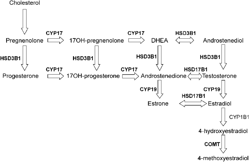 A tiny recap, cholesterol gets converted into testosterone and testosterone to oestrogen (for the full explanation, please see here). Within these conversions, some genes are at play. Specifically, CYP17, CYP21, CYP11a, and CYP19 are involved. Please see the complicated diagram below 👇🏼