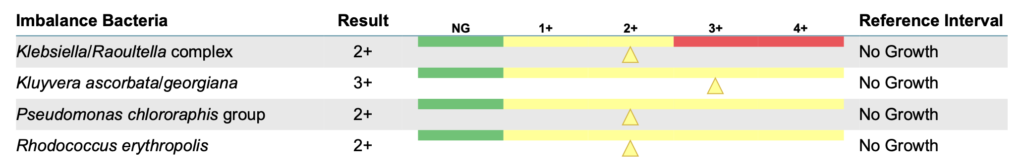 I have elevated levels of Klebsiella, Kluyvera, Pseudomonas, and Rhodococcus. These aren't necessarily "bad" bacteria, but they can contribute to inflammation and metabolic disturbances when they overgrow.