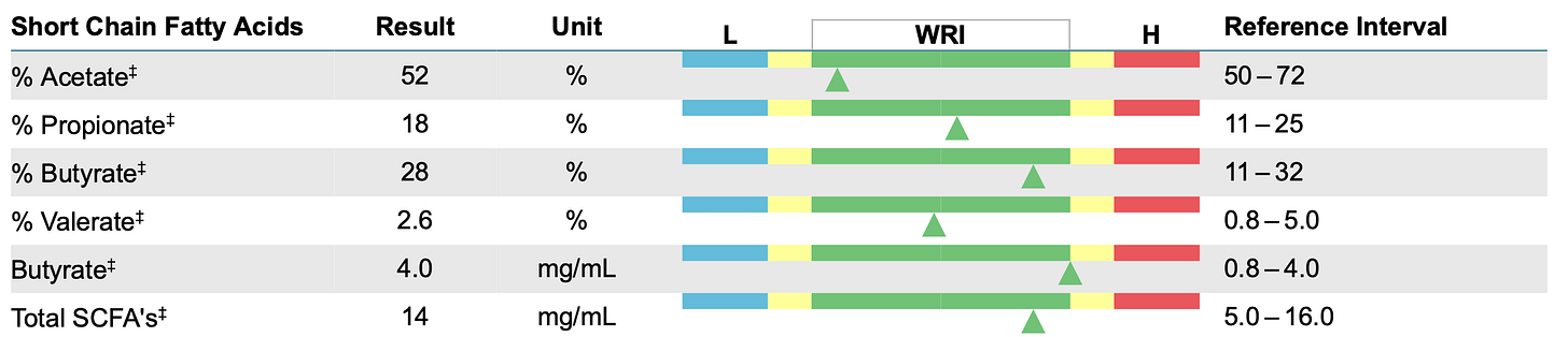 Speaking of butyrate, my short-chain fatty acid production is robust - sitting at the upper end of the reference range. This is fantastic because butyrate helps maintain our gut barrier, reduces inflammation, and supports insulin sensitivity. As we mentioned last week, SFCA helps keep our gut lining healthy and improves how our body handles blood sugar. It does this by helping your cells use energy more efficiently and supporting processes that stabilise blood sugar. The bacteria that produce these feed on fibre.